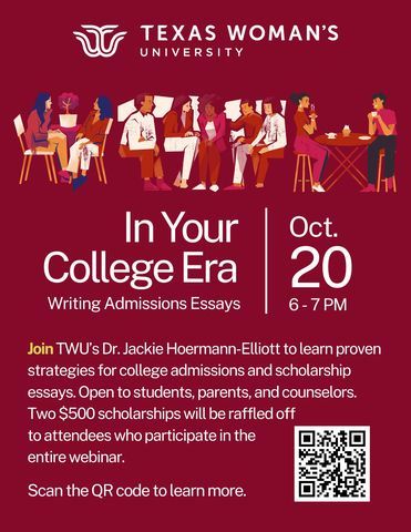 Texas Woman’s University will host In Your College Era: Admissions Essay Writing Workshop, a free webinar designed to demystify the essay-writing process for high school seniors, parents and counselors. The session will break down college admissions and scholarship essays step by step, offering proven storytelling techniquescommon pitfalls to avoidtactics to combat procrastination, and guidance on AI — when it’s a helpful tool, and when it should be set aside. Participants will leave with insights they can immediately apply to their own essay-writing journey.