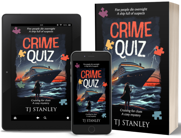 Crime Quiz: Cruising for Clues by T.J. Stanley is a fun who-dun-it set on a five-day mystery-writing-themed voyage from Sydney to Hobart and back. Inspired by an actual occurrence, the deaths of five passengers onboard a cruise ship overnight, the story features the events before and after the discovery of the fictional deceased during a major at sea.